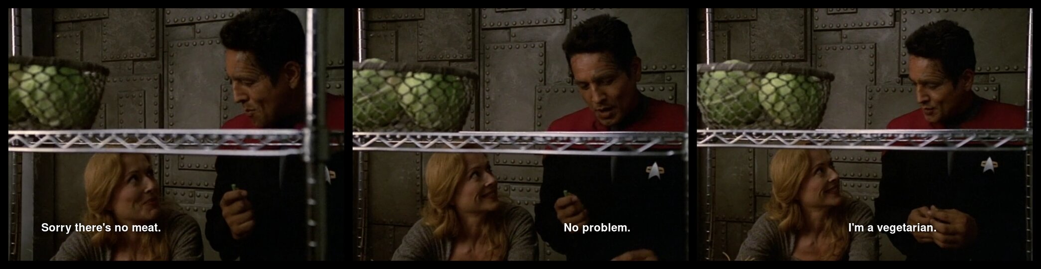 Ich finde es interessant, dass Chakotay am Ende der Serie tatsächlich mit einer ehemaligen Borg-Drohne liiert ist, nämlich mit Seven. Vielleicht steht er auf Frauen mit ähm… Implantaten.